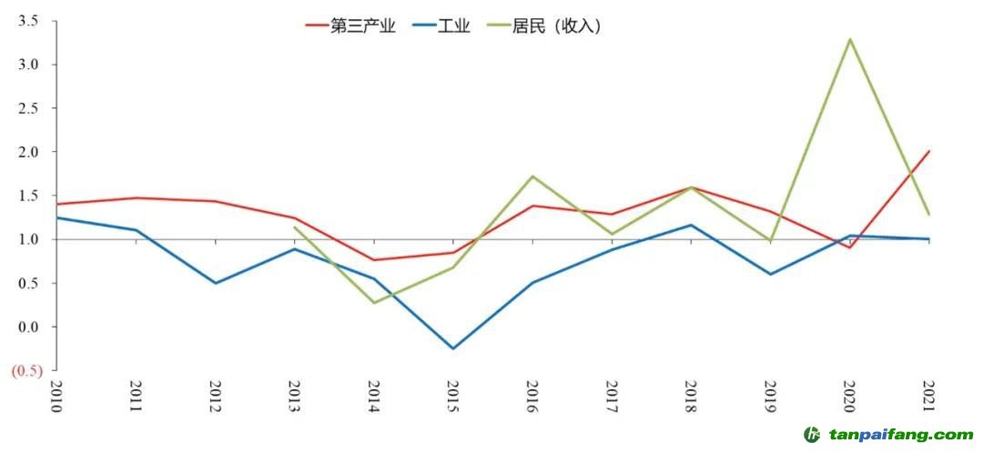 圖2 2010-2021年我國工業(yè)、第三產(chǎn)業(yè)和居民部門用電彈性