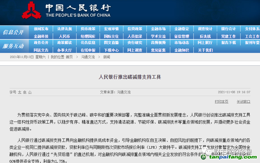 11月8日,中國人民銀行發(fā)布消息,推出碳減排支持工具。 禸嫆@唻洎:狆國湠棑倣茭昜蛧 τāńpāīfāńɡ.cōm