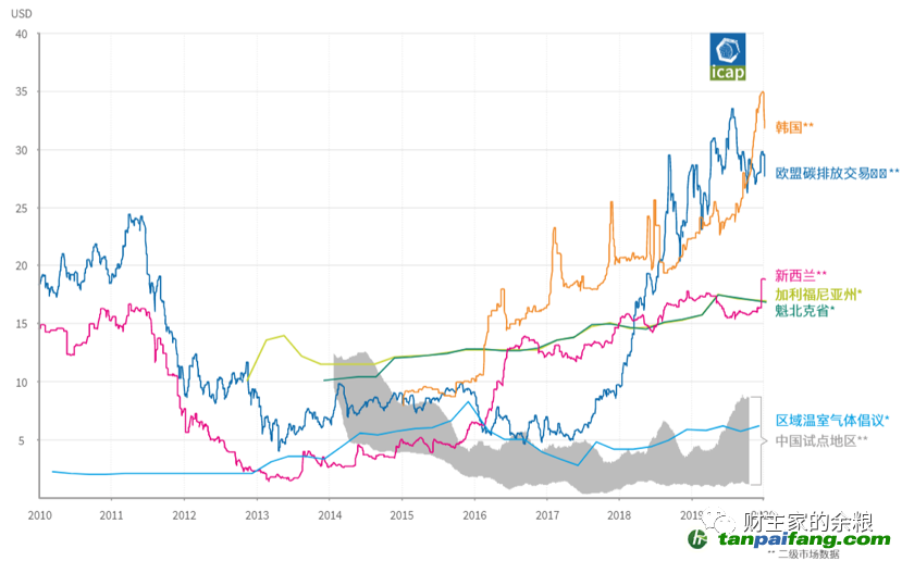 目前,全球主要的碳交易市場包括了歐盟排放權(quán)交易體系、英國排放交易體系、澳大利亞的歐洲國家信托、美國芝加哥氣候交易所等,而加拿大、新加坡和日本,都先后建立二氧化碳排放權(quán)的交易機制。 根據(jù)ICAP(全球碳行動伙伴組織)統(tǒng)計,2019年全球碳金融市場的交易額達到780億美元。下圖就是2010年以來幾個典型市場二氧化碳排放權(quán)的價格變化(美元/噸)。
