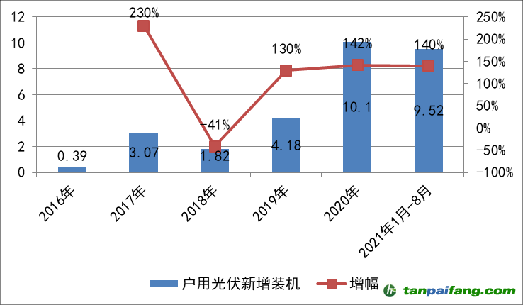 圖:2016-2021年前8月全國戶用光伏裝機新增規(guī)模及增速(GW,%)