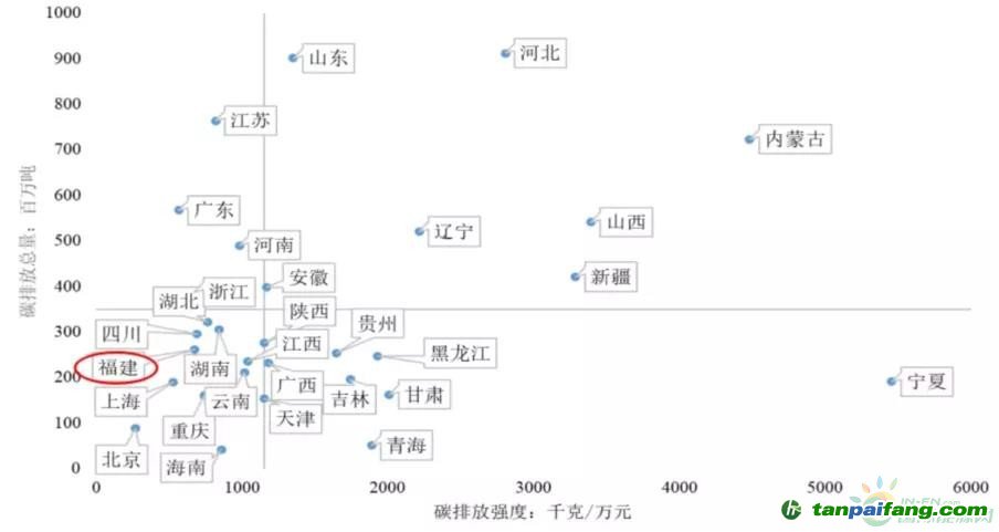 ◆總量差異:河北、山東、江蘇、內(nèi)蒙古、廣東排名前五,排放總量全部超過5億噸,產(chǎn)業(yè)結(jié)構(gòu)偏重、能源結(jié)構(gòu)偏煤,為域外提供大量高載能產(chǎn)品;福建全國(guó)排名16,排放總量為2.61億噸、低于全國(guó)平均水平。 本文@內(nèi)/容/來/自:中-國(guó)-碳^排-放-交易&*網(wǎng)-tan pai fang . com
