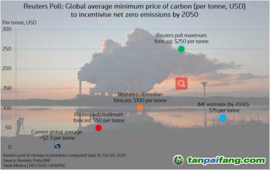 圖表 1 路透社全球最低平均碳價(jià)格調(diào)查圖表 本/文-內(nèi)/容/來/自:中-國-碳-排-放-網(wǎng)-tan pai fang . com