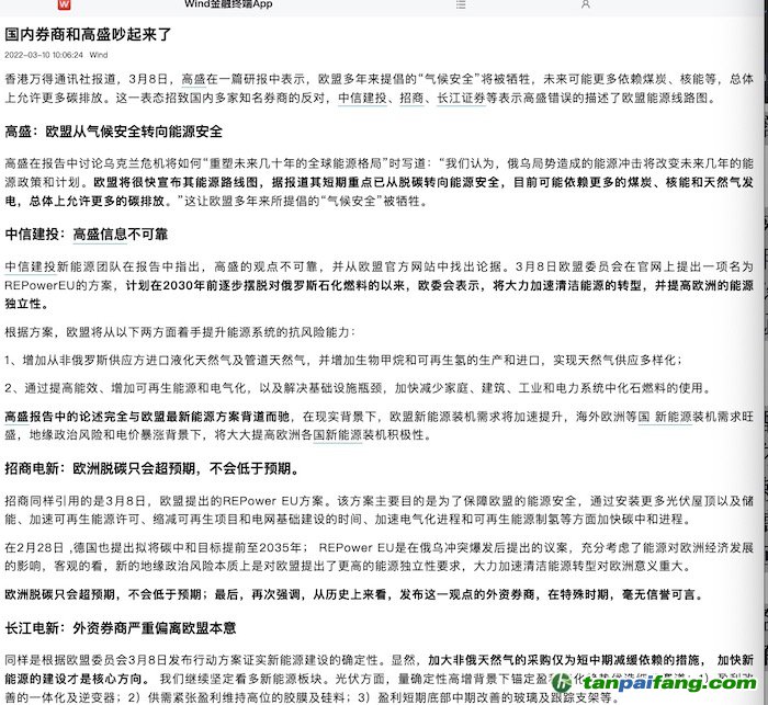 近期,一篇名為《國內券商和高盛吵起來了》的文章引發(fā)熱議。文中提及,“3月8日,高盛在一篇研報中表示,歐盟多年來提倡的‘氣候安全’將被犧牲,未來可能更多依賴煤炭、核能等,總體上允許更多