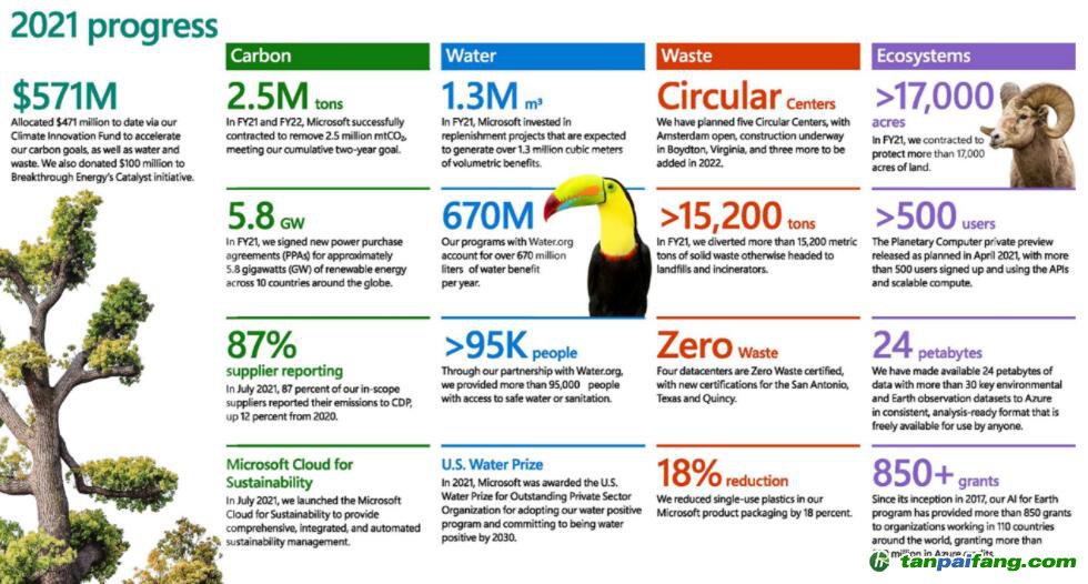 今天,微軟發(fā)布了《2021年度環(huán)境可持續(xù)發(fā)展報告》(以下簡稱“報告”),全面介紹了2021年,微軟為實現(xiàn)碳負排放、水資源正效益、零廢棄的“2030目標”所取得的進展。