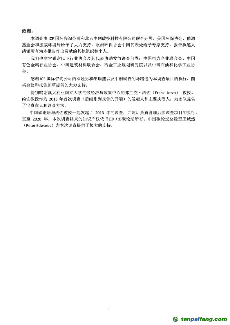 本年度碳價調(diào)查報告繼續(xù)由美國環(huán)保協(xié)會、能源基金會及挪威環(huán)境管理局提供資金支持,ICF 國際咨詢公司聯(lián)合北京中創(chuàng)碳投科技有限公司執(zhí)行,并得到了相關(guān)行業(yè)協(xié)會、電力集團以及行業(yè)同仁的大力支持。 內(nèi).容.來.自:中`國`碳#排*放*交*易^網(wǎng) t a np ai f an g.com