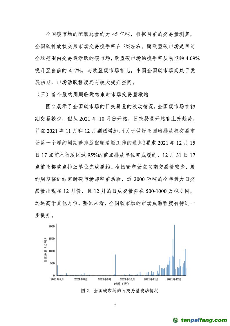 數(shù)據(jù)顯示,自2021年7月16日全國碳市場啟動線上交易以來,累計(jì)運(yùn)行114個交易日,第一個履約周期履約完成率達(dá)99.5%,情況較好。其日成交均價在40—60元/噸范圍內(nèi)波動,基本保持平穩(wěn)。但全國碳市場的配額總量約為45億噸,根據(jù)目前的交易量測算,其市場交易換手率在3%左右,相比全球范圍內(nèi)交易最活躍歐盟碳市場417%的換手率來說,全國碳市場尚處于發(fā)展初期,市場活躍程度還有較大提升空間。
