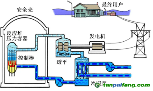 如下圖所示,核反應堆放置在壓力容器中進行可控鏈式核裂變反應,其冷卻劑入口水溫在290℃左右,出口水溫在330℃左右,一回路壓力為15.5MPa,壓力靠一臺穩(wěn)壓器進行控制,回路中不允許出現(xiàn)沸騰現(xiàn)象。核反應堆堆芯出口冷卻劑從壓力容器上部離開核反應堆,進入蒸汽發(fā)生器,將熱量傳遞給二回路。從蒸汽發(fā)生器產(chǎn)生的高溫蒸汽流過汽輪機,帶動發(fā)電機組發(fā)電。不能利用的大部分能量通過三回路排放。 本+文`內(nèi)/容/來/自:中-國-碳-排-放-網(wǎng)-tan pai fang . com