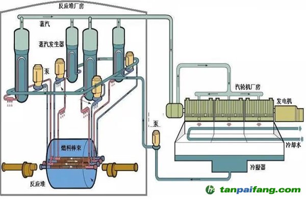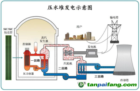 壓水堆是使用加壓的輕水(提高沸點)做冷卻劑和慢化劑的反應堆,采用富集度3%~5%的鈾做核燃料。壓水堆分為三個回路,一回路的作用是利用高壓水帶走堆內(nèi)熱量。二回路的作用是接收一回路高壓水傳遞出的熱量,并將其用來發(fā)電,三回路是用來將二回路發(fā)電后的余熱排放到環(huán)境(江、河、湖、?;虼髿猓?。
