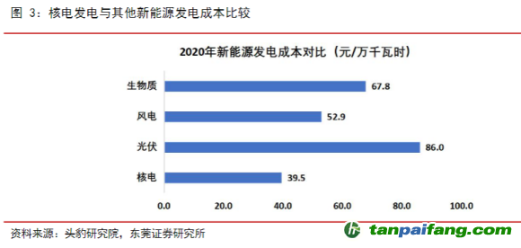 成本角度,核電在發(fā)電成本上明顯低于火電,相較于光伏、風電、生物質(zhì)等清潔能源,核電綜合發(fā)電成本、利用效率和機組壽命也具備一定競爭力。