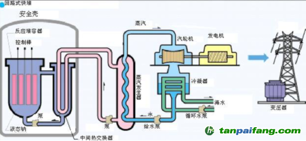 以回路式結(jié)構(gòu)為例,堆芯產(chǎn)生的熱量通過封閉的鈉冷卻劑回路先后傳遞給中間回路和汽水回路推動汽輪機組發(fā)電,與壓水堆不同的是鈉冷快堆增加了一個以液態(tài)鈉為介質(zhì)的中間回路,以避免蒸汽發(fā)生器泄露引起的鈉水反應威脅核反應堆本體。