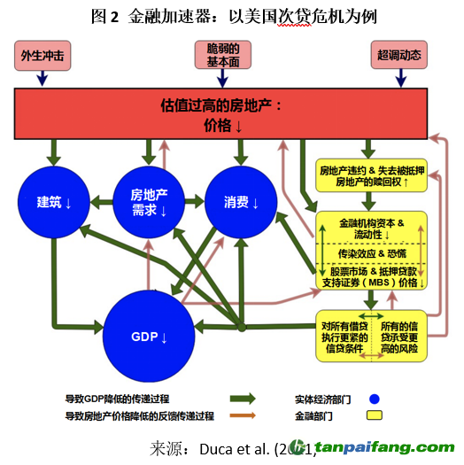 近期一項(xiàng)有關(guān)于國際房價(jià)周期的調(diào)查解釋了實(shí)體經(jīng)濟(jì)和金融部門之間的雙向作用所構(gòu)建的復(fù)雜的互動(dòng)體系。圖2呈現(xiàn)了次貸危機(jī)期間美國房價(jià)受到了來自哪些方面的負(fù)面沖擊,而這些沖擊的力度也因重要的非線性因素而被極大地放大。 本`文@內(nèi)-容-來-自;中^國_碳0排0放^交-易=網(wǎng) ta n pa i fa ng . co m