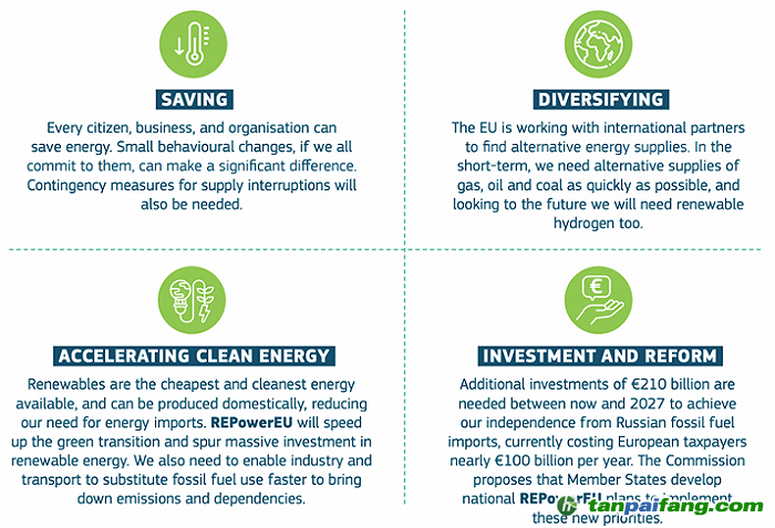 歐盟將從節(jié)能、能源供應多樣化、加速可再生能源建設(shè)、改革融資渠道等四個方面多管齊下,以完成能源綠色轉(zhuǎn)型。 本@文$內(nèi).容.來.自:中`國`碳`排*放^交*易^網(wǎng) t a np ai fan g.c om