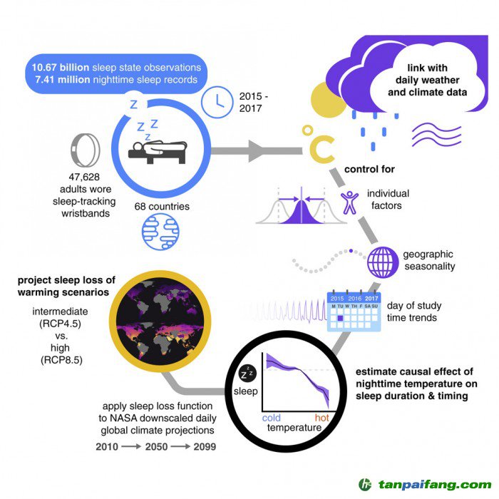 觀察性研究和調(diào)查數(shù)據(jù)先前已經(jīng)表明可能是這樣的情況,發(fā)現(xiàn)夜間溫度的上升和自我報(bào)告的睡眠不佳的夜晚之間存在聯(lián)系。為了尋找更具體的證據(jù),這項(xiàng)新研究的作者通過68個(gè)國家47000多名成年人佩戴的基于加速度計(jì)的追蹤腕帶收集了全球睡眠數(shù)據(jù),涵蓋了除南極洲以外的所有大陸。