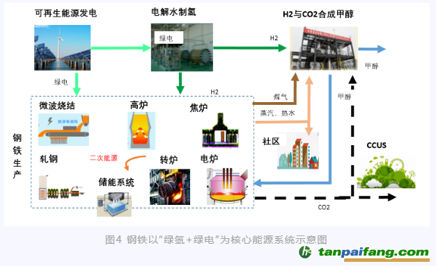 在未來(lái)建設(shè)以新能源為主體的新型電力系統(tǒng)背景下,鋼鐵行業(yè)能源系統(tǒng)應(yīng)以電能替代和氫能替代為主線,綠電和綠氫的組合可以通用在鋼鐵生產(chǎn)的各個(gè)環(huán)節(jié)。因此,構(gòu)建以“綠電+綠氫”為核心的能源系統(tǒng),以甲醇作為優(yōu)質(zhì)載體,加上氫冶金技術(shù)的創(chuàng)新與應(yīng)用,使鋼鐵擺脫對(duì)化石能源的依賴,從源頭上解決碳排放問(wèn)題,是實(shí)現(xiàn)低碳甚至“零碳”排放的最佳途徑。同時(shí)依靠“互聯(lián)網(wǎng)+”加快能源數(shù)字化、智能化升級(jí),提高能源系統(tǒng)靈活感知及高效運(yùn)行能力,最終實(shí)現(xiàn)能源系統(tǒng)聯(lián)通共享。