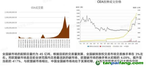 我國去年的碳排放交易量大約在17億噸左右,成交金額在76億元上下,聽上去比較少。其背后的原因有兩點,其一是機(jī)構(gòu)還沒能加入碳市場,這部分交易量是潛在的,其二是市場剛剛開放,企業(yè)以履約為主,以投資目的做碳交易的企業(yè)很少,因而換手率只有13%,這也導(dǎo)致了交易量較低。中國碳價格在開盤時是48元,到今天,碳價漲到60元左右,始終保持增長態(tài)勢。