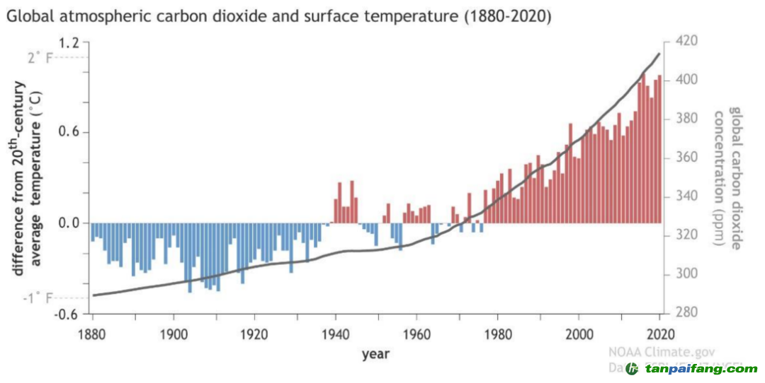 注:(一)左軸代表當(dāng)年地面溫度與二十世紀(jì)平均地面溫度的差距;(二)右軸大氣層二氧化碳水平 本+文`內(nèi)/容/來/自:中-國(guó)-碳-排-放-網(wǎng)-tan pai fang . com