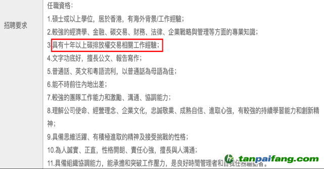 目前,國(guó)內(nèi)符合香港排放權(quán)交易所招聘要求的從業(yè)人員可謂鳳毛麟角,“十年以上碳排放權(quán)交易相關(guān)工作經(jīng)驗(yàn)”這一條就會(huì)刷掉了絕大多數(shù)人。