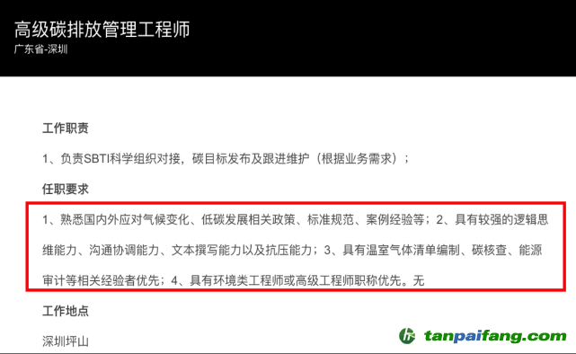 新能源車龍頭企業(yè)比亞迪(002594.SZ)也在自家網(wǎng)站發(fā)布有“高級(jí)碳排放管理工程師”“碳排放管理工程師”職位。該崗位對(duì)于相關(guān)從業(yè)經(jīng)驗(yàn)、專業(yè)職稱等提出了明確要求,但并未對(duì)從業(yè)年數(shù)做出限制。