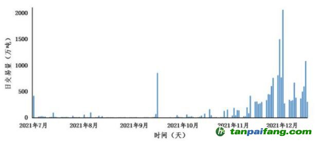 (全國碳市場在履約周期臨近結(jié)束時(shí)空前活躍,12月日成交量多在500-1000萬噸之間,遠(yuǎn)遠(yuǎn)高于其他月份。圖表來源: