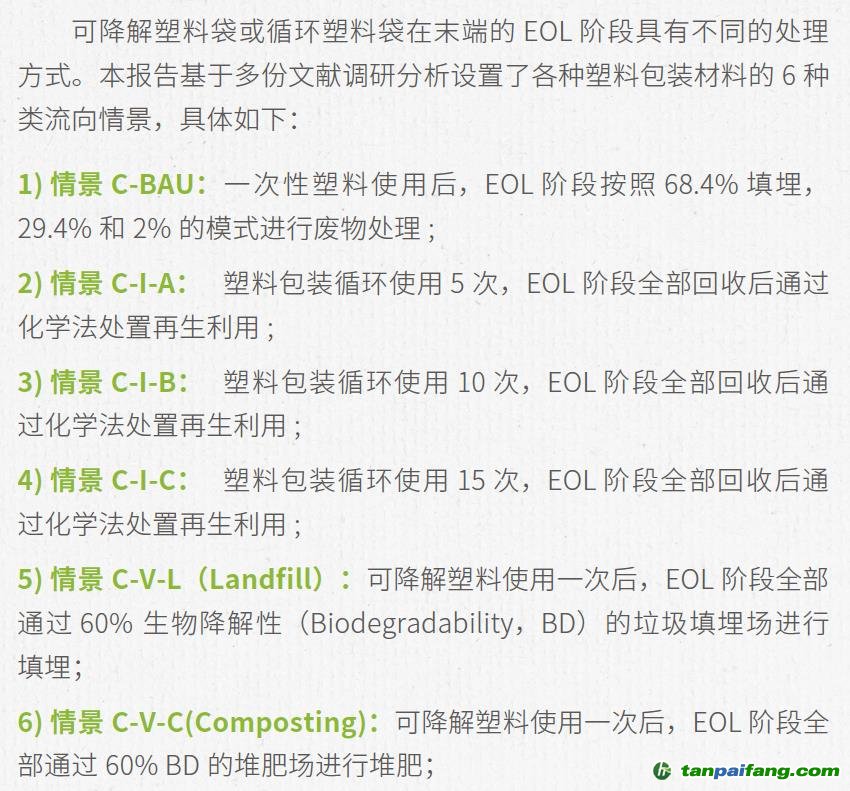 《報告》設置了各種塑料包裝材料的6種類流向情景,對塑料包裝碳排放進行了預測,數(shù)據(jù)顯示,可降解包裝材料不管是通過填埋還是堆肥方式進行末端治理,產(chǎn)生的碳排放都偏高,且處理處置方式所需條件較為嚴格。相比之下,推廣應用循環(huán)包裝塑料不僅能夠有效控制塑料廢棄物產(chǎn)生,也能減少快遞包裝材料所導致的碳排放。