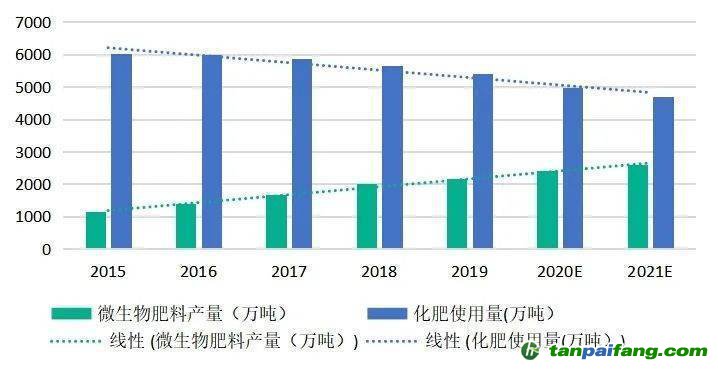 以微生物肥料為例,可顯著加大肥料效果和利用率,減少肥料使用,進(jìn)而促進(jìn)碳減排。微生物肥料2019年產(chǎn)量已突破2000萬噸,年復(fù)增長率約8%,截至2021年8月,我國微生物肥料新增登記數(shù)量達(dá)1108個(gè)。與之相左的是農(nóng)用化肥施用量卻持續(xù)下滑,據(jù)估算2021年化肥使用量將低于5000萬噸。