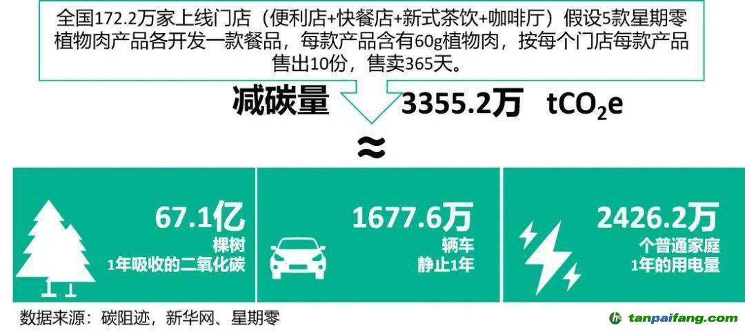 同時(shí),按照全國便利店、新式茶飲、咖啡廳、快餐廳總數(shù)172.2萬家計(jì)算,理想情況下,按5款產(chǎn)品計(jì)算,每個(gè)門店每款產(chǎn)品每天售出10份,假設(shè)每款產(chǎn)品含有60g植物肉,售賣365天,一年合計(jì)減碳量將達(dá)到3355.2萬噸。