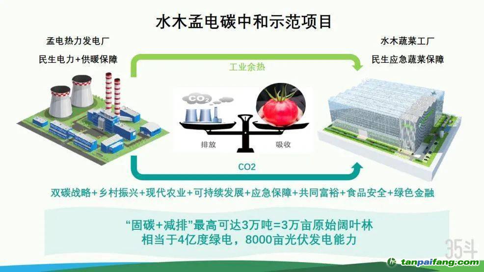 垂直農(nóng)業(yè)是種植業(yè)的代表,不僅為人類提供經(jīng)濟(jì)類的食物,在減碳角度還為人類提供巨大生態(tài)價(jià)值。以水木九天為例,其在河南輝縣市孟莊鎮(zhèn)的實(shí)驗(yàn)性項(xiàng)目,直接將水木番茄蔬菜工廠搬進(jìn)了當(dāng)?shù)氐碾姀S中。通過燃煤熱力電廠所產(chǎn)生的余熱和二氧化碳與蔬菜工廠結(jié)合,使得蔬菜工廠的能耗成本趨于零,而二氧化碳的介入使得產(chǎn)量得到60%的提升。據(jù)估算,“固碳+減排”量最高可達(dá)3萬噸,相當(dāng)于3萬畝原始落葉林,甚至相當(dāng)于4億度綠電,8000畝光伏發(fā)電的能力。