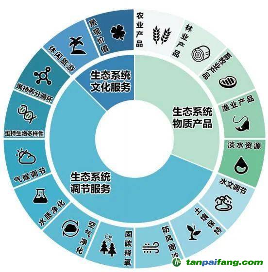 一方面,提供人類生產(chǎn)生活所必需的食物、醫(yī)藥、木材、生態(tài)能源及原材料等物質(zhì)產(chǎn)品;另一方面,提供調(diào)節(jié)氣候、水源涵養(yǎng)、土壤保持、洪水調(diào)蓄、防風(fēng)固沙等生態(tài)調(diào)節(jié)服務(wù);還包括休閑旅游、景觀價(jià)值、康養(yǎng)服務(wù)等文化服務(wù)。