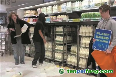 店員試圖干預(yù)時,她說這是一次非暴力抗議,呼吁植物性飲食,對抗氣候變化。還有一人舉著“以植物為基礎(chǔ)的未來”的標(biāo)語。