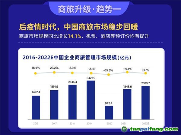 《白皮書》數(shù)據(jù)顯示,疫情對中國商旅市場影響明顯,但隨著國內(nèi)經(jīng)濟穩(wěn)定復(fù)蘇以及國內(nèi)疫情基本得到有效控制,預(yù)計2022年中國商旅管理市場在2021年的基礎(chǔ)上繼續(xù)回暖,市場規(guī)模預(yù)計達2108.7億元,同比增長14.1%。 禸嫆@唻洎:狆國湠棑倣茭昜蛧 τāńpāīfāńɡ.cōm