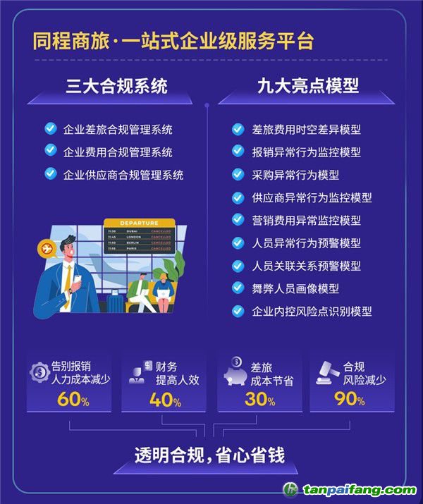 同程商旅以整合企業(yè)差旅、費控、OA系統(tǒng)、支付、報銷為一體,可為企業(yè)提供商旅服務(wù)新標(biāo)準(zhǔn),助力企業(yè)實現(xiàn)消費支出合規(guī)透明、降本增效,提升員工滿意度。數(shù)據(jù)顯示,同程商旅通過數(shù)智化管理手段為企業(yè)差旅成本優(yōu)化30%,告別線下報銷流程后財務(wù)人效提高40%,進行合規(guī)管控后企業(yè)風(fēng)險減少90%。此外,同程商旅不僅對企業(yè)管理所需的基本功能做了全面深度覆蓋,還通過獨有的特色數(shù)智化合規(guī)平臺為行業(yè)提供新的服務(wù)模式,最終為企業(yè)前置識別不合規(guī)行為,做到有效預(yù)警、規(guī)避風(fēng)險。