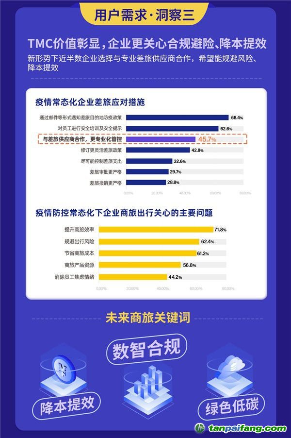 《白皮書》調(diào)研發(fā)現(xiàn),疫情常態(tài)化下,提高商旅效率、降低出行風(fēng)險和控制商旅成本是當(dāng)前企業(yè)最關(guān)心的問題。而結(jié)算合規(guī)便捷、較快的響應(yīng)速度和24小時客戶服務(wù)是影響企業(yè)選擇差旅供應(yīng)商的最主要因素。企業(yè)商旅管理需求則集中在合規(guī)、節(jié)流、提效和員工滿意度四個方面。圍繞這些需求,商旅服務(wù)供應(yīng)商需從資源、系統(tǒng)和服務(wù)商三個層面進行能力的構(gòu)建。 本文@內(nèi)/容/來/自:中-國-碳^排-放-交易&*網(wǎng)-tan pai fang . com
