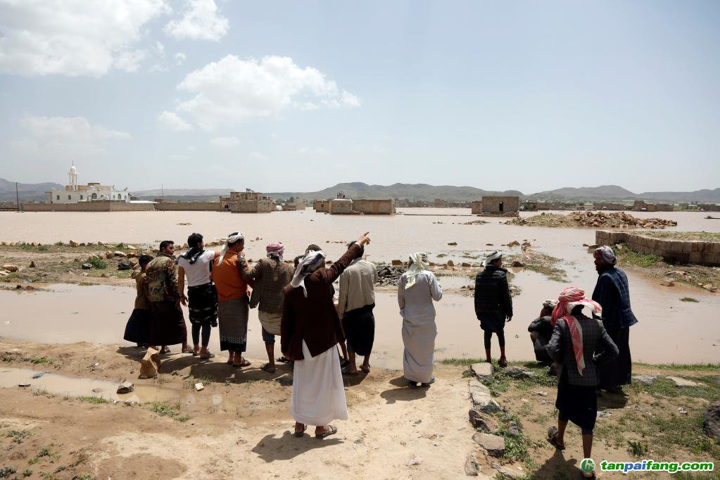 2022年8月23日,在也門扎馬爾省馬巴爾地區(qū),人們查看被洪水淹沒的土地。(新華社發(fā))