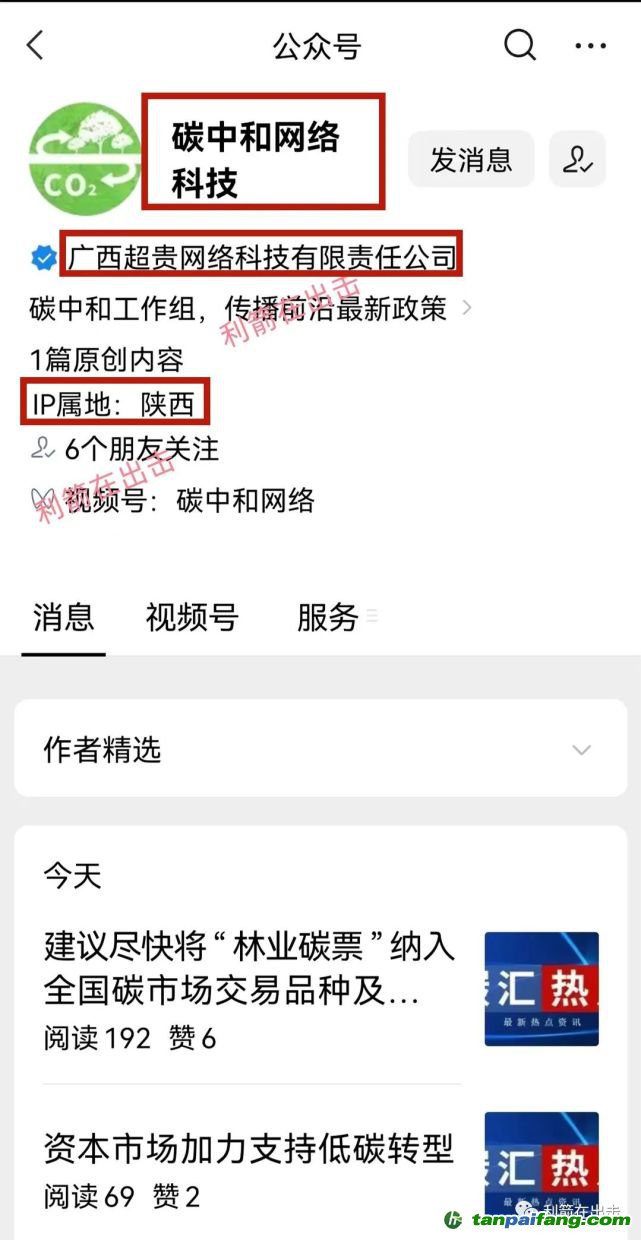 曾經宣傳“碳中和”項目有個公眾號“碳中和網絡科技”,主體登記的是“廣西超貴網絡科技有限責任公司”。廣西的公司發(fā)文的IP地址在陜西,不知道有多少人懷疑過這公司沒有?該公眾號目前已經被封號了。 內.容.來.自:中`國`碳#排*放*交*易^網 t a np ai f an g.com