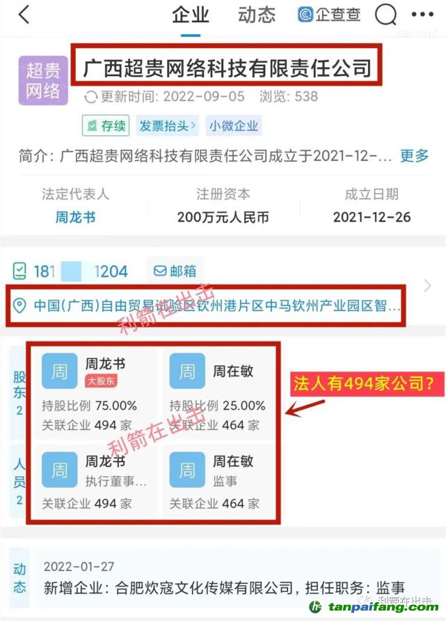 今天不是談這個項目的后續(xù),主要是講“碳中和”項目牽連出的許許多多的虛假的公司正在注銷跑路之中,很多公司就在今天(10月8日)以后將永遠消失!在企查查中查“廣西超貴網絡科技有限責任公司”,公司成立于2021年12月26日,法人周龍書,名下顯示有494家公司,股東周在敏名下有464家公司,對于有實力的老板,我們認為就是有再多的公司也不足為奇,但是這家公司的法人與股東旗下的公司是反常的!請跟著利箭的腳步,捂住小心臟往下看。