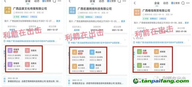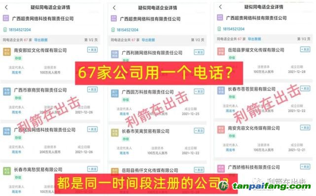 通過地址“中國(廣西)自由貿易試驗區(qū)欽州港片區(qū)中馬欽州產業(yè)園區(qū)智慧園2號樓四層06室”,隨便查一家注冊的公司,都能查到不少法人與股東旗號都有幾十家公司,最多的在全國達到了幾百家公司,許多人一天最多的時候,能注冊成立幾十家公司,利箭不敢再查下去了,小心臟受不了.......