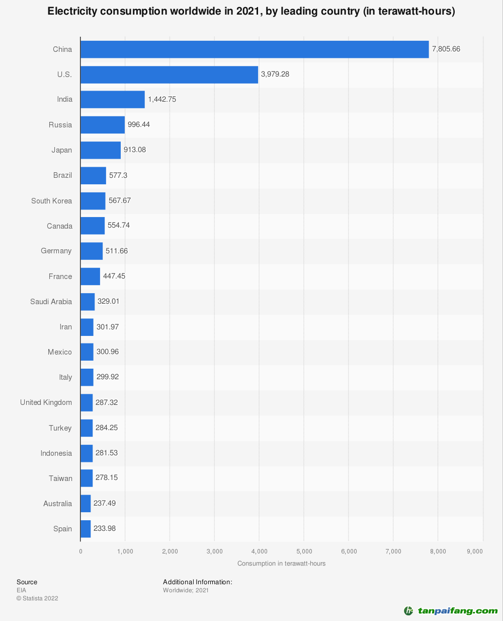 到目前為止,中國(guó)是世界上用電量最多的國(guó)家,2021年的用電量超過(guò)7800太瓦時(shí)。美國(guó)是當(dāng)年第二大電力消費(fèi)國(guó),消耗了近4000太瓦小時(shí)。印度緊隨其后,但差距很大。