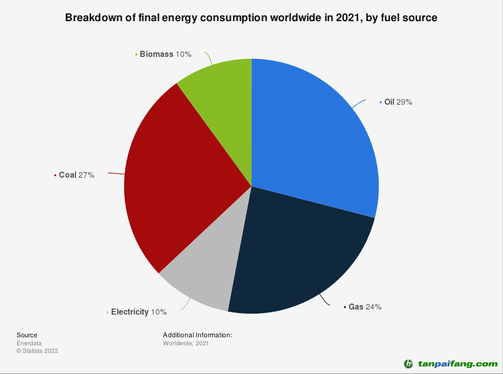 2021年,石油占全球最終能源消費(fèi)的最大份額,占29%??傮w而言,化石燃料占當(dāng)年全球最終能源消費(fèi)的主導(dǎo)地位,天然氣和煤炭分別占24%和27%。