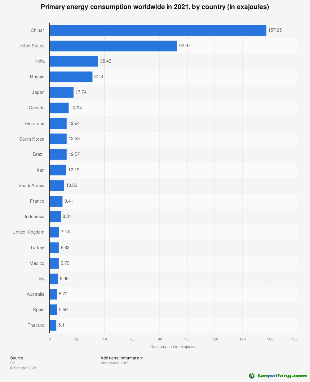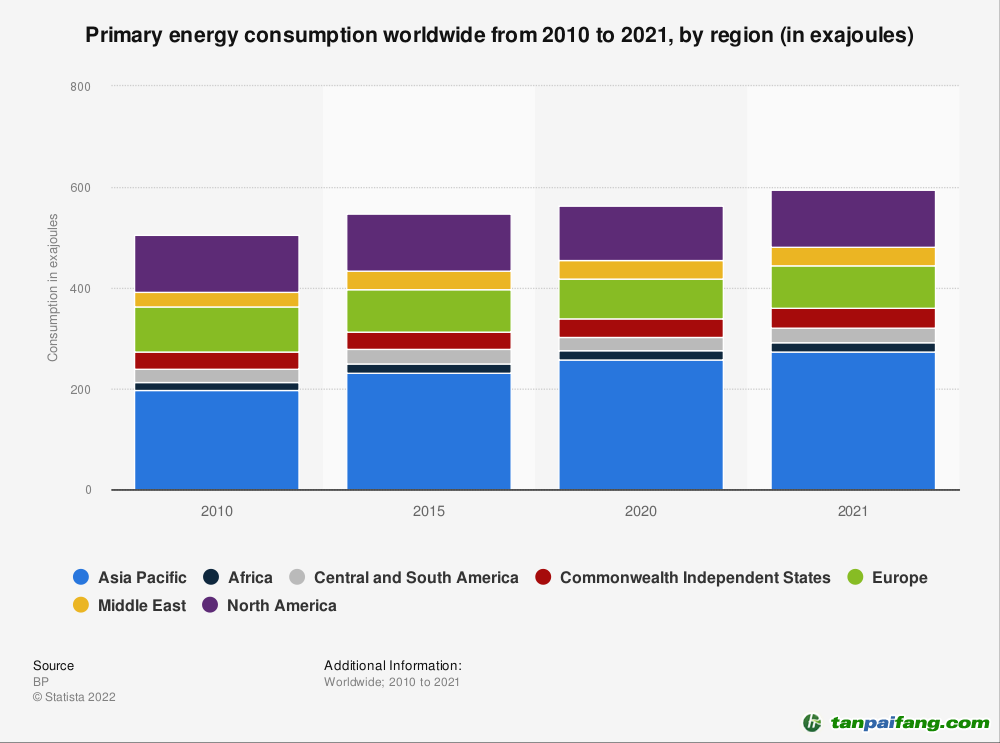 亞太地區(qū)是世界上消耗一次能源最多的地區(qū),2021年約為272.5艾焦耳。一次能源消耗是指在提煉或轉(zhuǎn)換之前使用的原油能源。一次能源的消費(fèi)量在全球范圍內(nèi)普遍增加,自2010年以來(lái),亞太地區(qū)的消費(fèi)量增加了75艾焦耳以上。