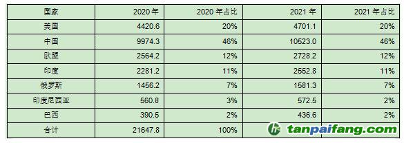 碳排放中,二十國(guó)集團(tuán)中的美國(guó)、中國(guó)、歐盟、印度、俄羅斯、印度尼西亞、巴西等7大經(jīng)濟(jì)體在2020年、2021年分別貢獻(xiàn)了全球溫室氣體排放的67%和68%??傮w來(lái)說(shuō),七個(gè)成員的