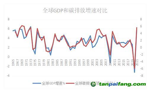 同步增長的原因是經濟增長加大了各經濟部門對電力、石油等能源的需求,而電力生產、石油、天然氣等化石能源使用都會產生大量