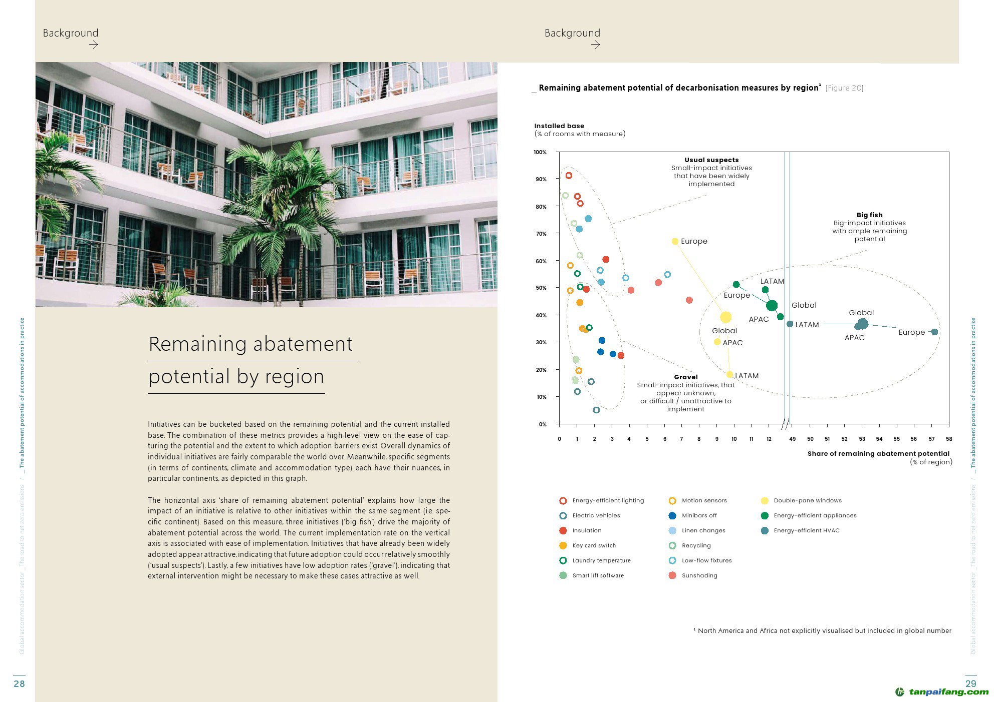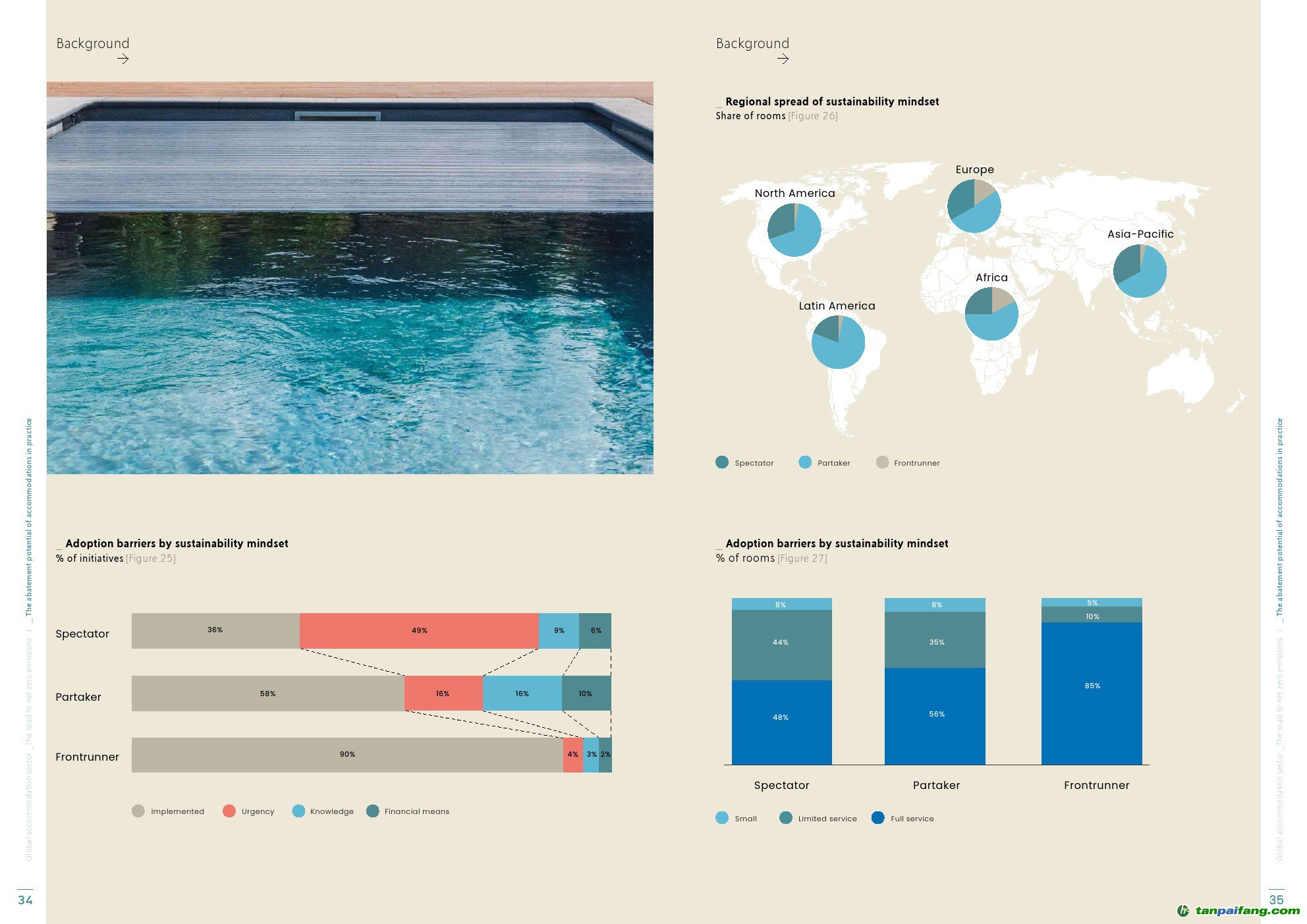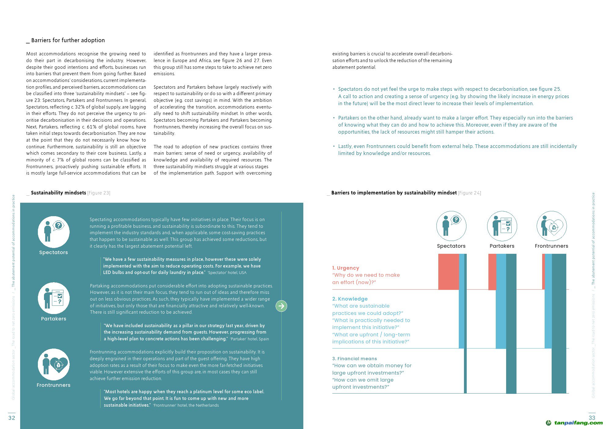 報告確定了關(guān)于可持續(xù)發(fā)展的實施和重要性的三種適應(yīng)心態(tài)。 觀望者約占市場的 32%,并未積極追求可持續(xù)發(fā)展目標(biāo),迄今為止僅實施了標(biāo)準(zhǔn)行業(yè)舉措或僅出于節(jié)省成本的目的采取了行動。 為這一細(xì)分市場營造緊迫感,例如通過強調(diào)不作為的代價,將是向前發(fā)展的重要推動力。參與者約占 61%,他們希望采取行動,只要這不會對其住宿的吸引力產(chǎn)生負(fù)面影響。 最后同樣重要的是,領(lǐng)跑者約占市場供應(yīng)量的 7%。