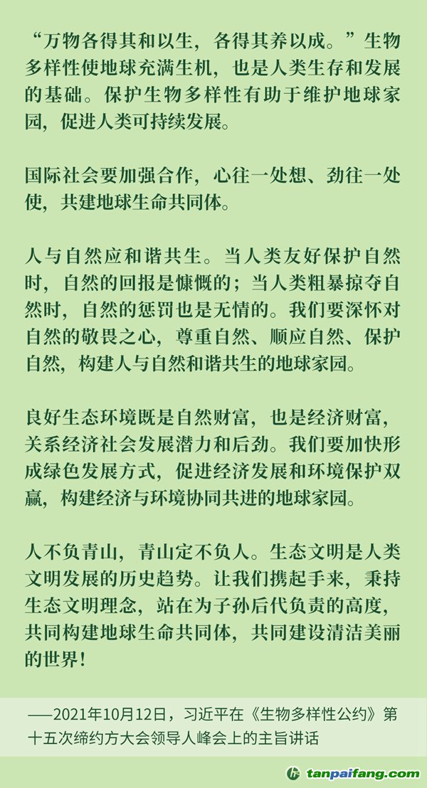 今天,讓我們重溫習近平主席講話金句,進一步認識生物多樣性保護的重要性,以實際行動保護我們的地球家園。 本+文+內(nèi).容.來.自:中`國`碳`排*放*交*易^網(wǎng) t a np ai fan g.com