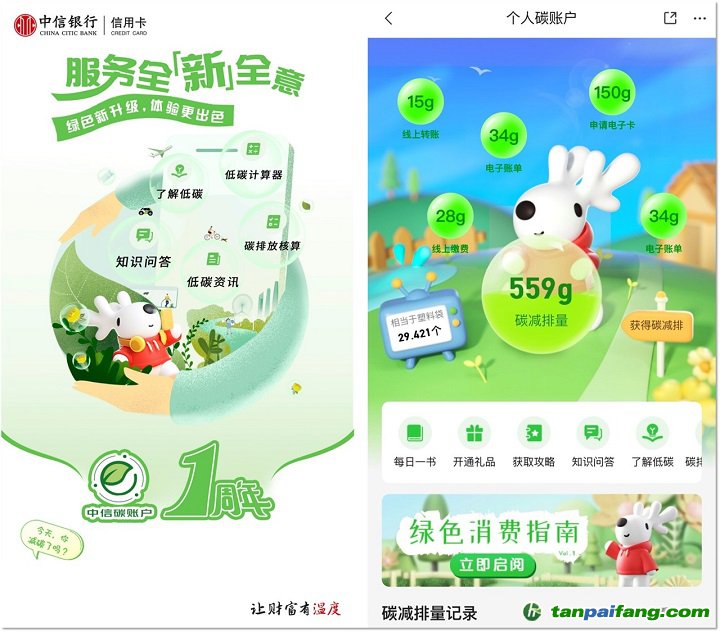 目前,“中信碳賬戶” 已實(shí)現(xiàn)涵蓋信用卡和借記卡共9個金融場景的碳減排量核算,具體包括:電子信用卡、電子賬單、線上繳費(fèi)(含水費(fèi)、電費(fèi)、燃?xì)赓M(fèi)等)、無介質(zhì)借記卡開通、線上轉(zhuǎn)賬、信秒貸辦理、信秒貸還款等金融場景。同時,“中信碳賬戶”已支持全民開戶,用戶可通過中信銀行手機(jī)銀行APP、動卡空間APP、中信財富廣場等多個渠道注冊開通,全面推動綠色低碳廣泛融入民眾生活。此外,中信銀行已與眾多合作方構(gòu)建“綠·信·匯”低碳生態(tài)聯(lián)盟,包括華為、京東、銀聯(lián)等16家知名品牌加入,通過計量個人碳減排量的“中信碳賬戶”,讓碳資產(chǎn)得到歸集。 本+文+內(nèi)/容/來/自:中-國-碳-排-放(交—易^網(wǎng)-tan pai fang . com