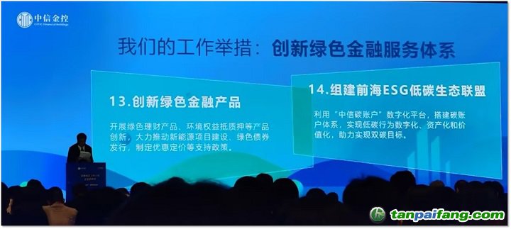 近日,中國中信金融控股有限公司(以下簡稱“中信金控”)在深圳前海舉辦深港地區(qū)上市公司企業(yè)家峰會,聯(lián)合前海創(chuàng)新研究院共同發(fā)布《中國中信金融控股有限公司落實(shí)“金融支持前海30條”1030行動方案》(以下簡稱“1030行動方案”),并與前海管理局簽署戰(zhàn)略協(xié)議。會上,中信金控向15家企業(yè)家辦公室成員單位授牌,共同啟動了“前海ESG低碳生態(tài)聯(lián)盟”,提出在發(fā)展綠色金融服務(wù)方面,將通過創(chuàng)新綠色金融產(chǎn)品和組建前海ESG低碳生態(tài)聯(lián)盟等兩大舉措,構(gòu)建創(chuàng)新綠色金融服務(wù)體系,利用“中信碳賬戶”數(shù)字化平臺,搭建碳賬戶體系,助力企業(yè)實(shí)現(xiàn)低碳行為數(shù)字化、資產(chǎn)化和價值化。