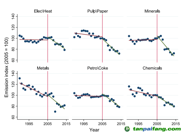 圖4顯示了EU ETS覆蓋的六個主要部門的排放趨勢。可以看出,在ETS實施后,每個行業(yè)的排放量下降得更快。但文章強調(diào),不能因此說ETS導致了排放量的下降,因為有可能是由其他因素驅(qū)動的,特別是2009年的全球金融危機,與所有行業(yè)的排放量大幅下降密切相關(guān)。