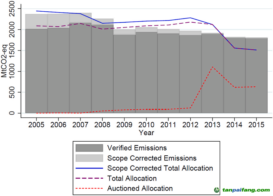 根據(jù)EUTL的排放數(shù)據(jù)繪制了所有受監(jiān)管設(shè)施的排放上限和經(jīng)過驗證的排放量隨時間的變化(圖2),EUTL是歐盟委員會的集中碳排放清單,記錄了所有受監(jiān)管設(shè)施的排放??梢钥闯?,ETS所涵蓋設(shè)施核實的排放量隨時間推移,呈現(xiàn)下降趨勢。 本+文內(nèi).容.來.自:中`國`碳`排*放*交*易^網(wǎng) ta np ai fan g.com