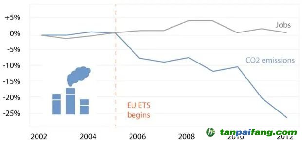 圖1 ETS對歐盟就業(yè)和CO2排放的影響 內(nèi)/容/來/自:中-國/碳-排*放^交%易#網(wǎng)-tan p a i fang . com