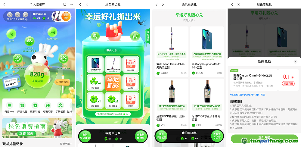 其次,中信銀行信用卡推出系列綠色消費(fèi)活動(dòng),持續(xù)激勵(lì)廣大用戶積極踐行低碳行為。近期上線的“綠色消費(fèi)幸運(yùn)禮”活動(dòng),持卡人可以通過合作品牌商戶消費(fèi)、綠色支付和綠色運(yùn)動(dòng)等多種方式輕松獲得綠信能量,收集綠信能量后可合成獲得幸運(yùn)草,使用幸運(yùn)草即可參與幸運(yùn)抽獎(jiǎng)或兌換好禮獲得iPhone、戴森吸塵器等23種商品的0.1折積分商城兌換券、最高1萬積分、幸運(yùn)草道具等多重好禮,進(jìn)一步實(shí)現(xiàn)“低碳權(quán)益、普惠大眾”的碳普惠機(jī)制初衷,對(duì)更多綠色消費(fèi)場(chǎng)景下的個(gè)人的減碳行為賦予價(jià)值,提供普惠權(quán)益。 本`文@內(nèi)/容/來/自:中-國(guó)^碳-排-放^*交*易^網(wǎng)-tan pai fang. com