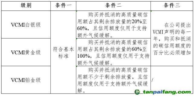 碳市場(chǎng)誠(chéng)信倡議(Voluntary Carbon Markets Integrity Initiative,VCMI)推出《聲明行為準(zhǔn)則》(Claims Code of Practice)4,旨在指導(dǎo)公司和其他非國(guó)家行為者參與碳市場(chǎng)并做出可信的氣候聲明。該準(zhǔn)則為減少和消除溫室氣體排放的投資引入了三種聲明等級(jí)——鉑金、黃金和白銀(詳見表1),并概述了提出“VCMI聲明”所需四個(gè)步驟,包括(1)滿足VCMI的氣候戰(zhàn)略基本標(biāo)準(zhǔn),(2)選擇聲明等級(jí),(3)選擇滿足條件的高質(zhì)量